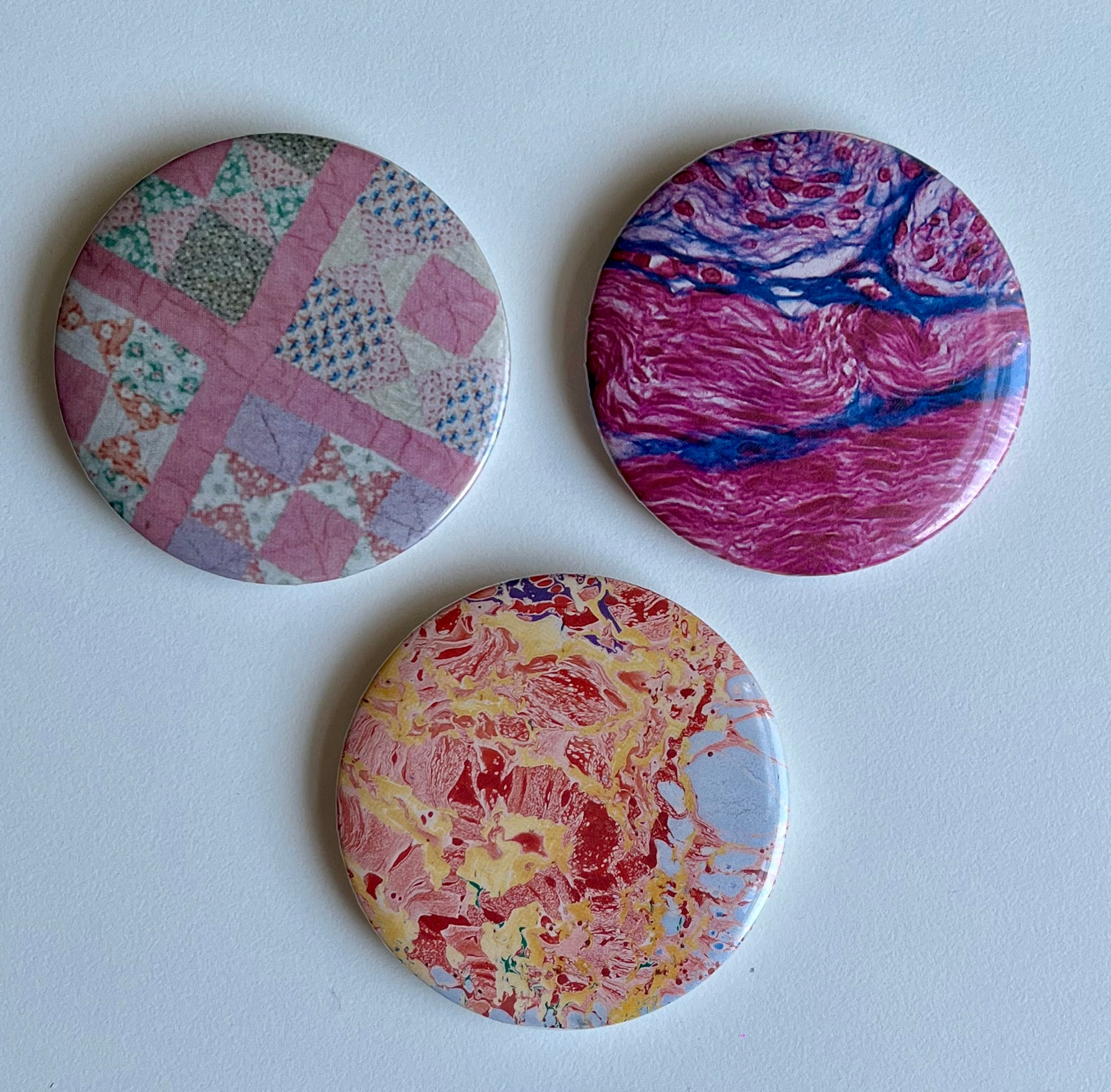 A pack of THREE 2.25" pinback buttons, hand-pressed in Brooklyn from found source material