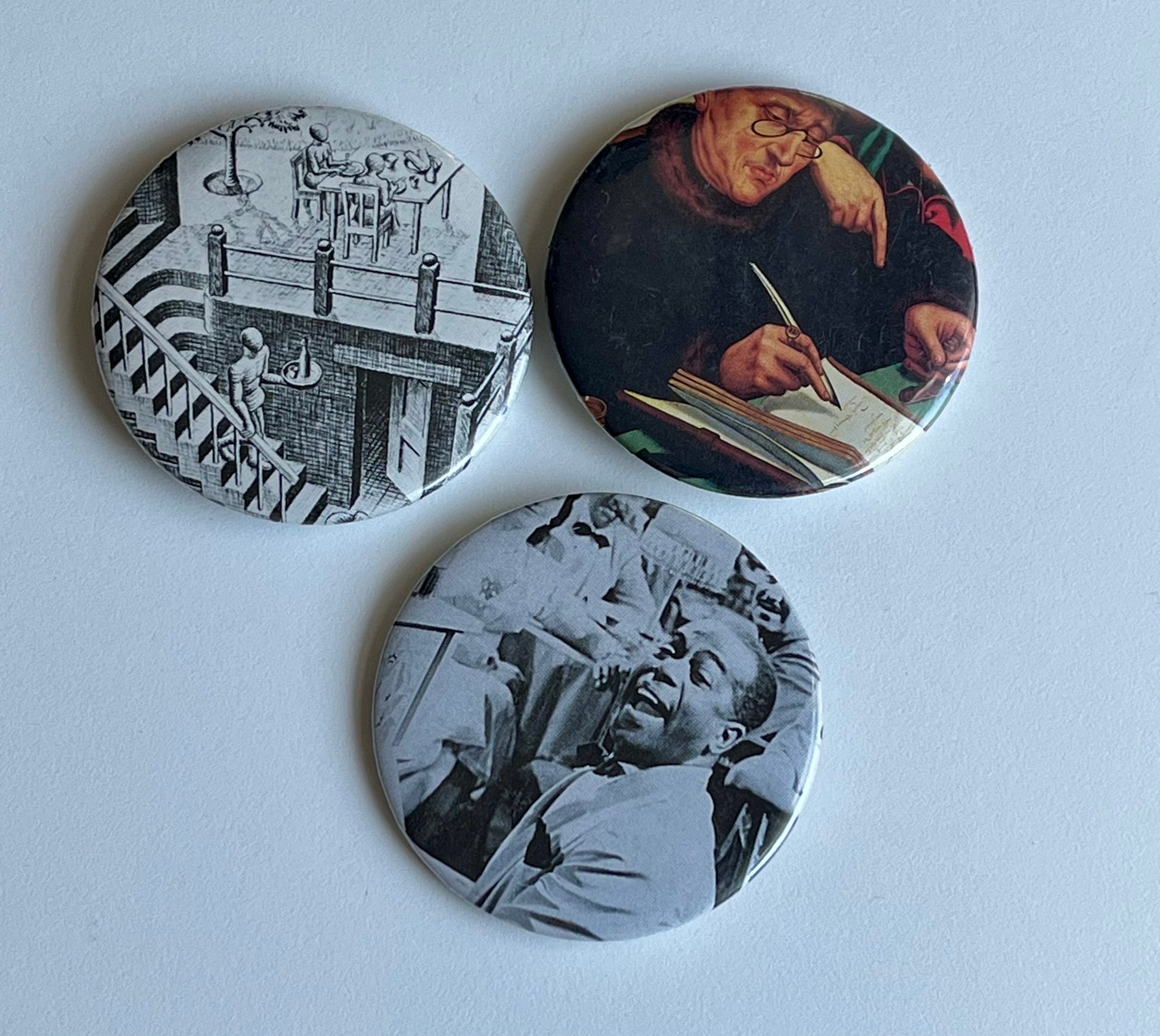 A pack of THREE 2.25" pinback buttons, hand-pressed in Brooklyn from found source material