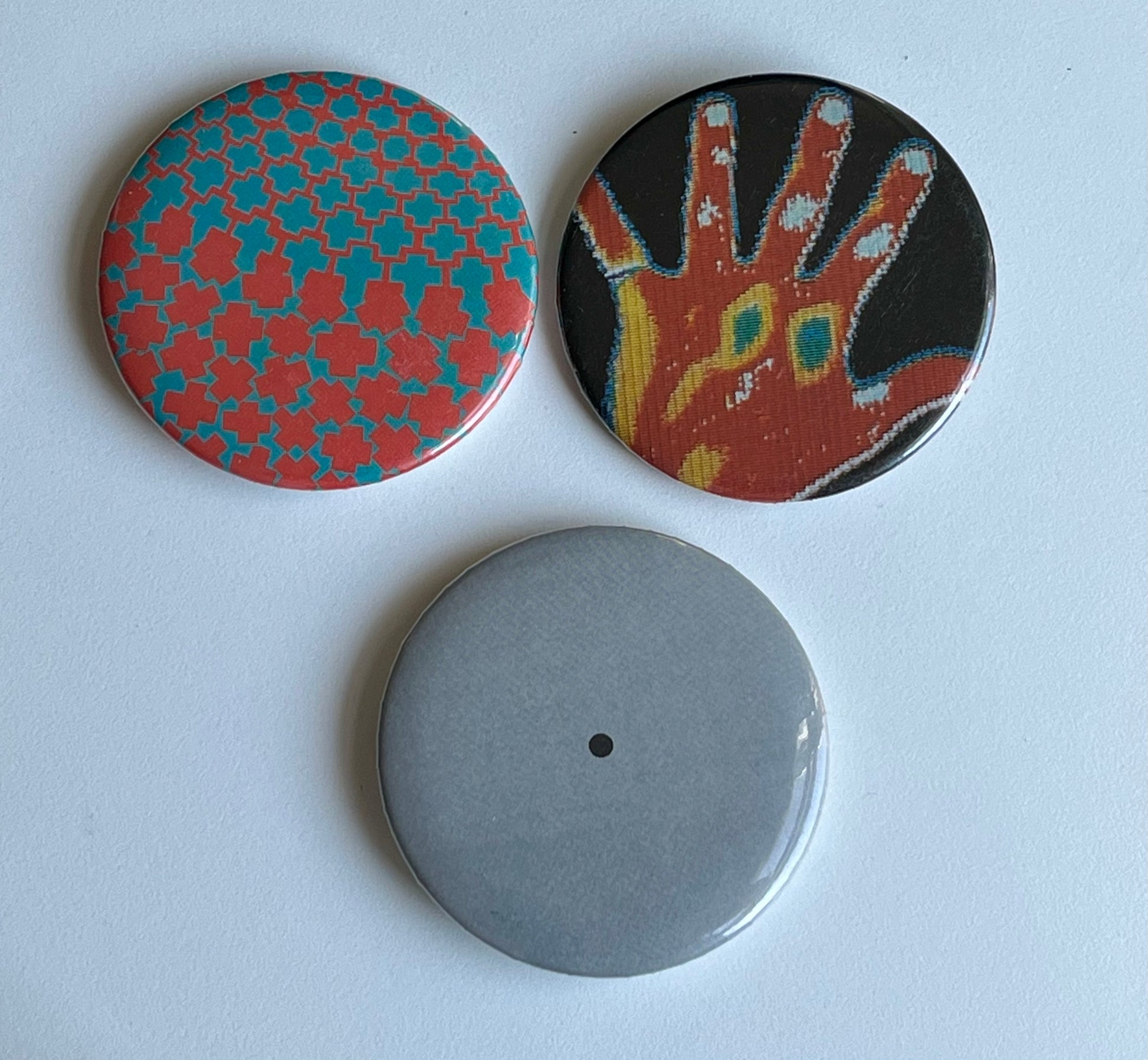 A pack of THREE 2.25" pinback buttons, hand-pressed in Brooklyn from found source material