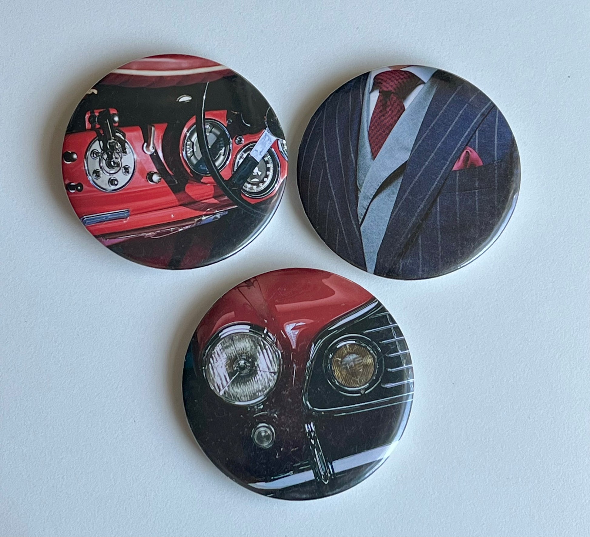 A pack of THREE 2.25" pinback buttons, hand-pressed in Brooklyn from found source material