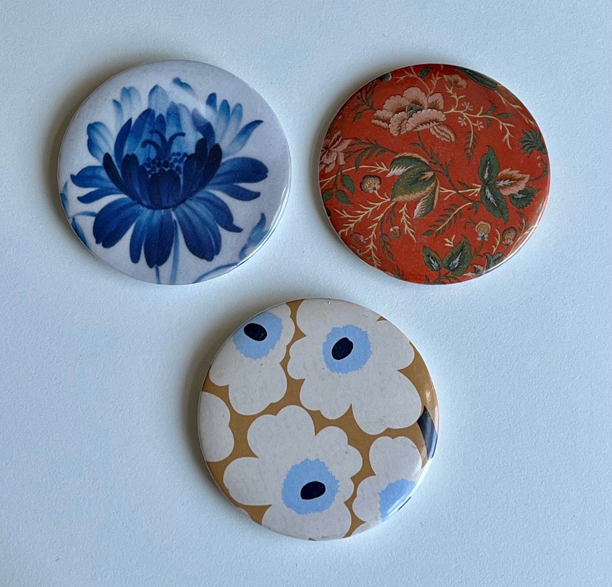 A pack of THREE 2.25" pinback buttons, hand-pressed in Brooklyn from found source material
