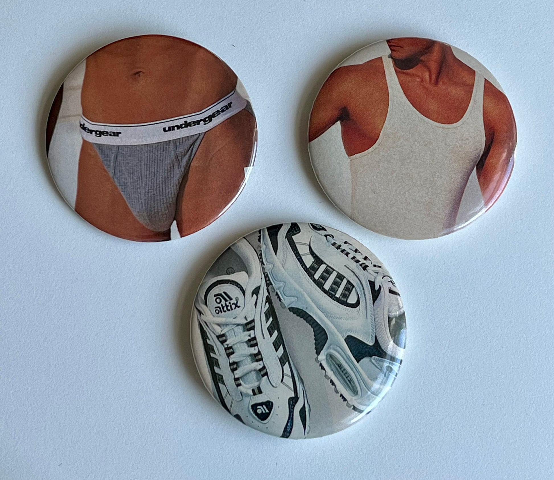 A pack of THREE 2.25" pinback buttons, hand-pressed in Brooklyn from found source material