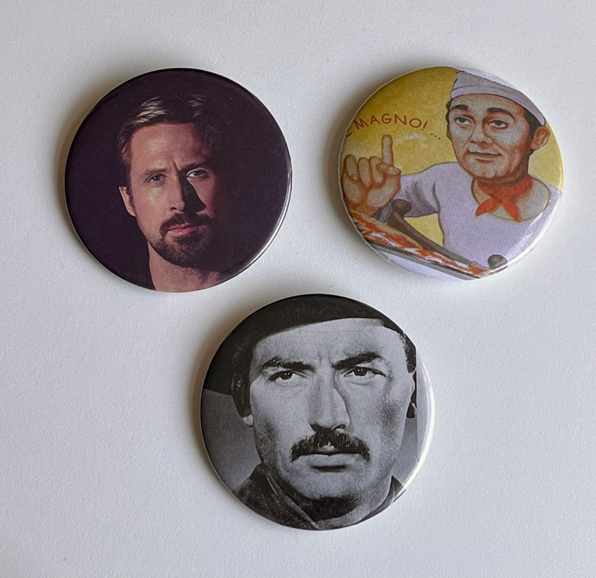 A pack of THREE 2.25" pinback buttons, hand-pressed in Brooklyn from found source material