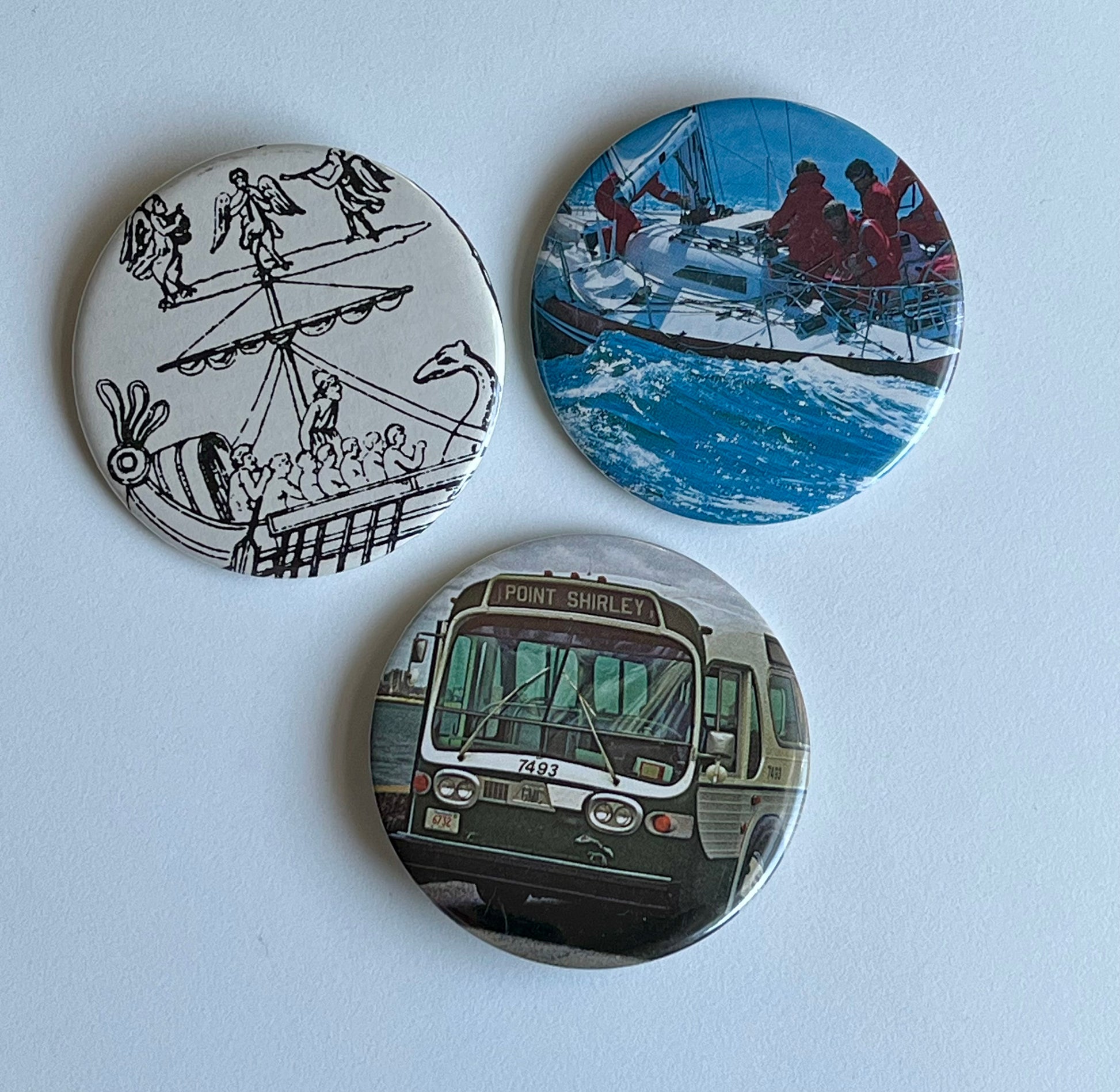 A pack of THREE 2.25" pinback buttons, hand-pressed in Brooklyn from found source material