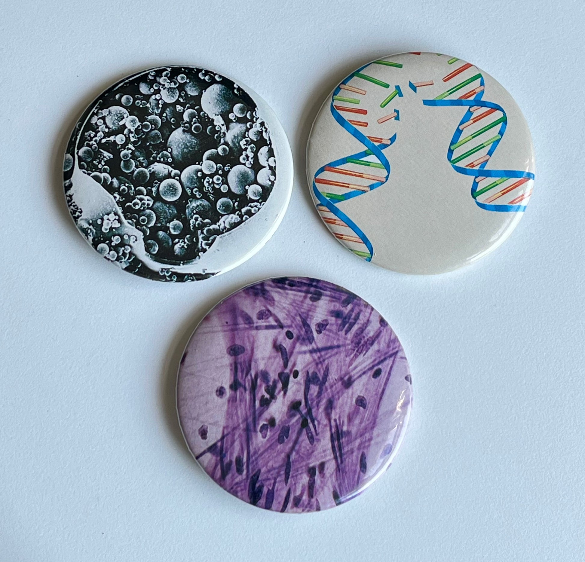 A pack of THREE 2.25" pinback buttons, hand-pressed in Brooklyn from found source material