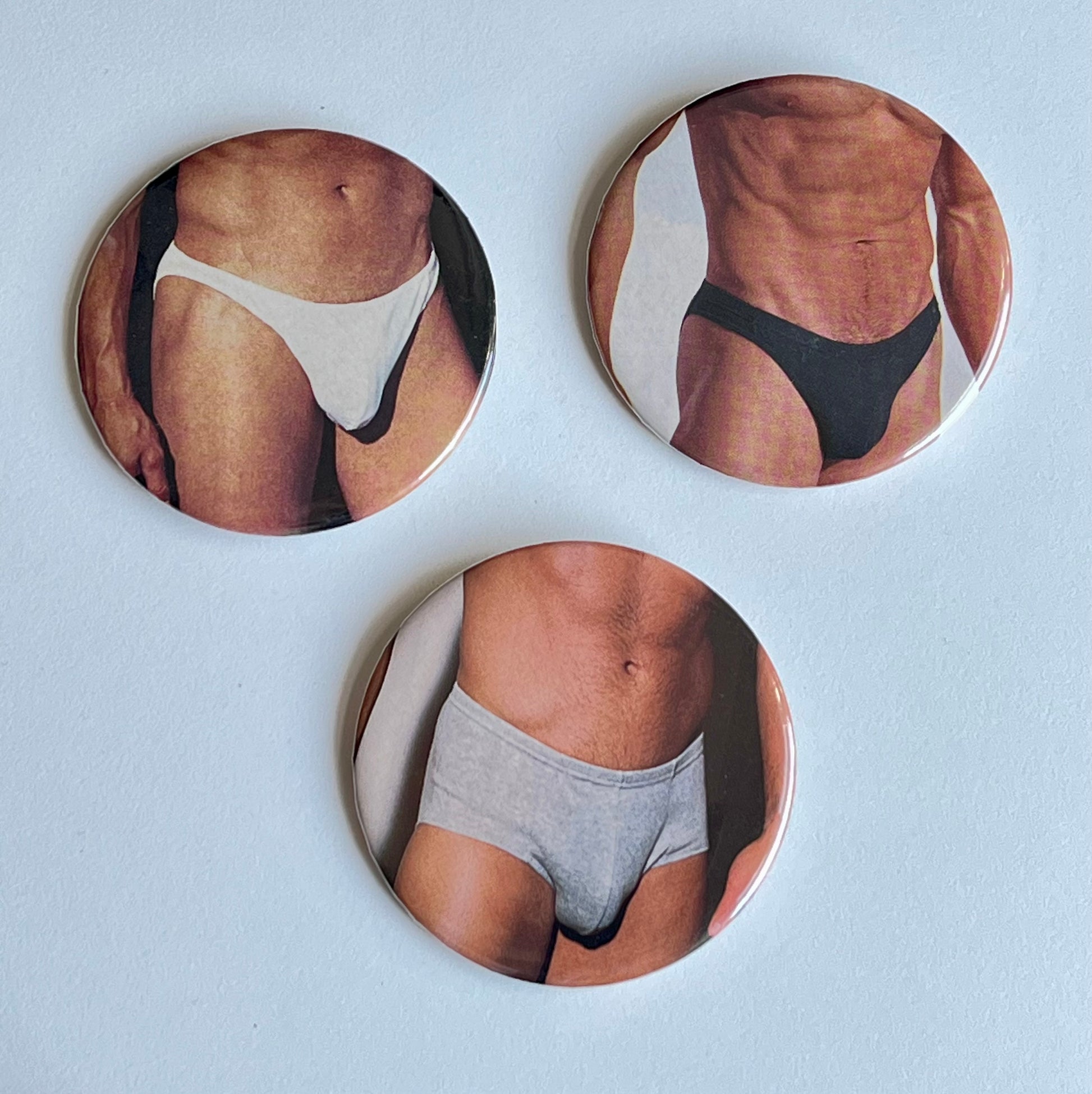 A pack of THREE 2.25" pinback buttons, hand-pressed in Brooklyn from found source material