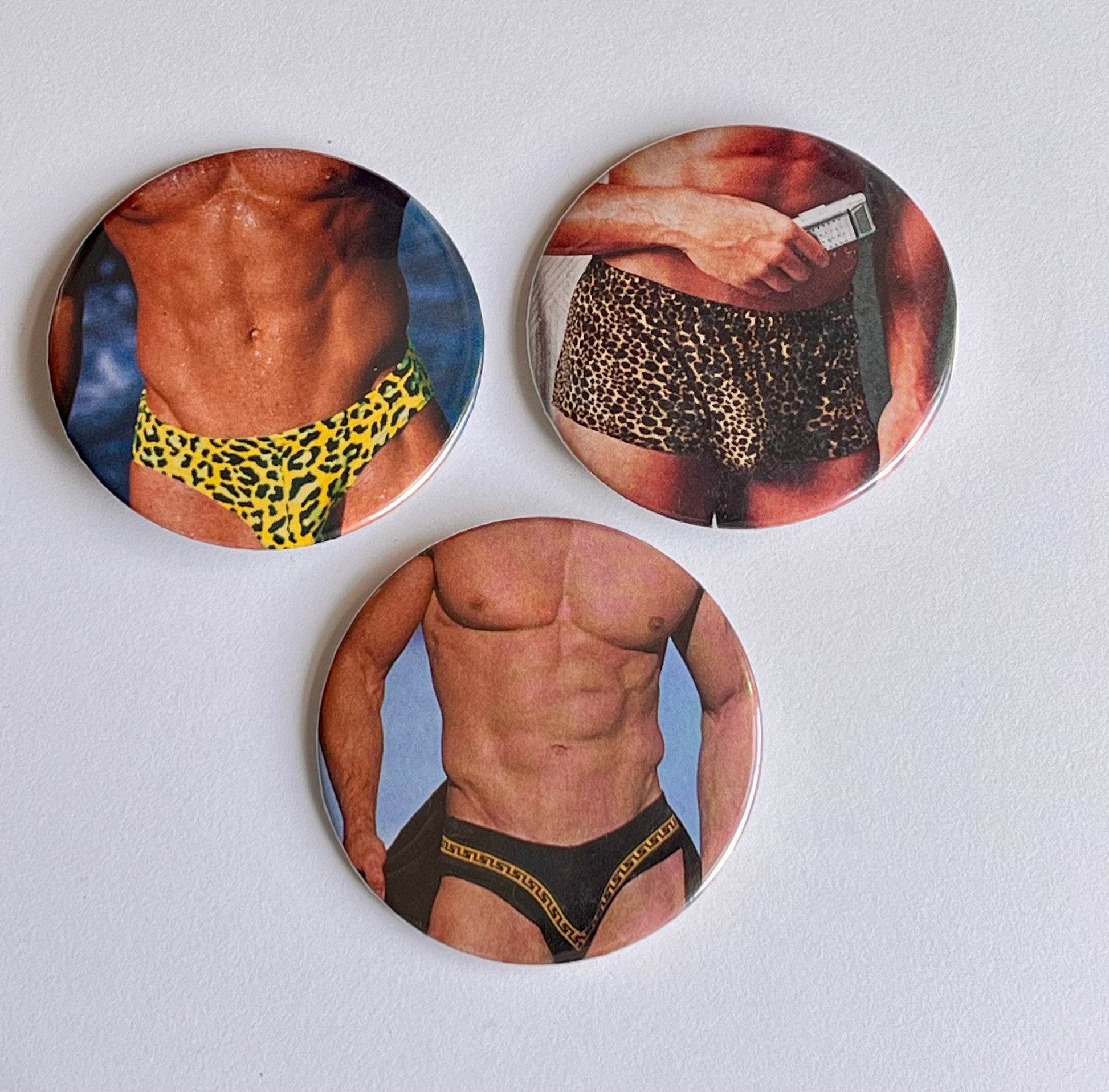 A pack of THREE 2.25" pinback buttons, hand-pressed in Brooklyn from found source material