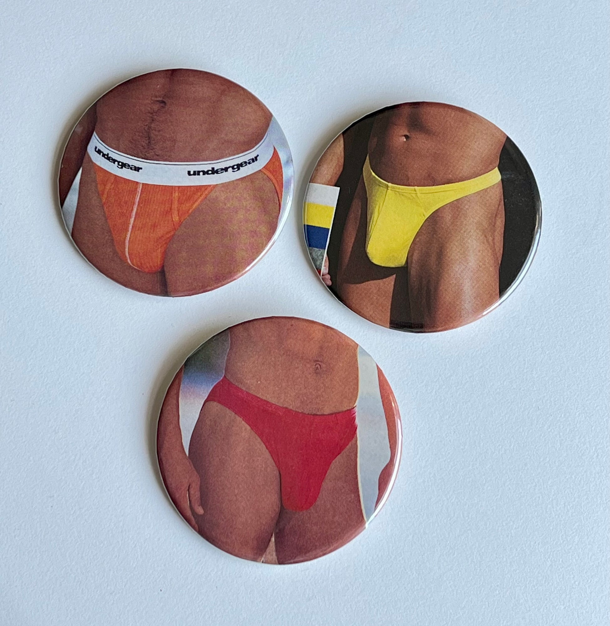 A pack of THREE 2.25" pinback buttons, hand-pressed in Brooklyn from found source material